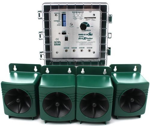 Биоакустический отпугиватель птиц "Super BirdXPeller PRO" оснащен сменным блоком памяти на 8 фонограмм тревожных криков птиц, которые транслирует на четыре выносных динамика, обеспечивая защиту от пернатых на территории площадью в 24000 м2. Имеет встроенный пульт гибкой настройки (громкость, периодичность повторения фонограмм, режимы день/ночь и пр.). Отпугиватель и динамики помещены в водозащищенные корпуса. Питается отпугиватель от сети 220 В или внешнего аккумулятора.